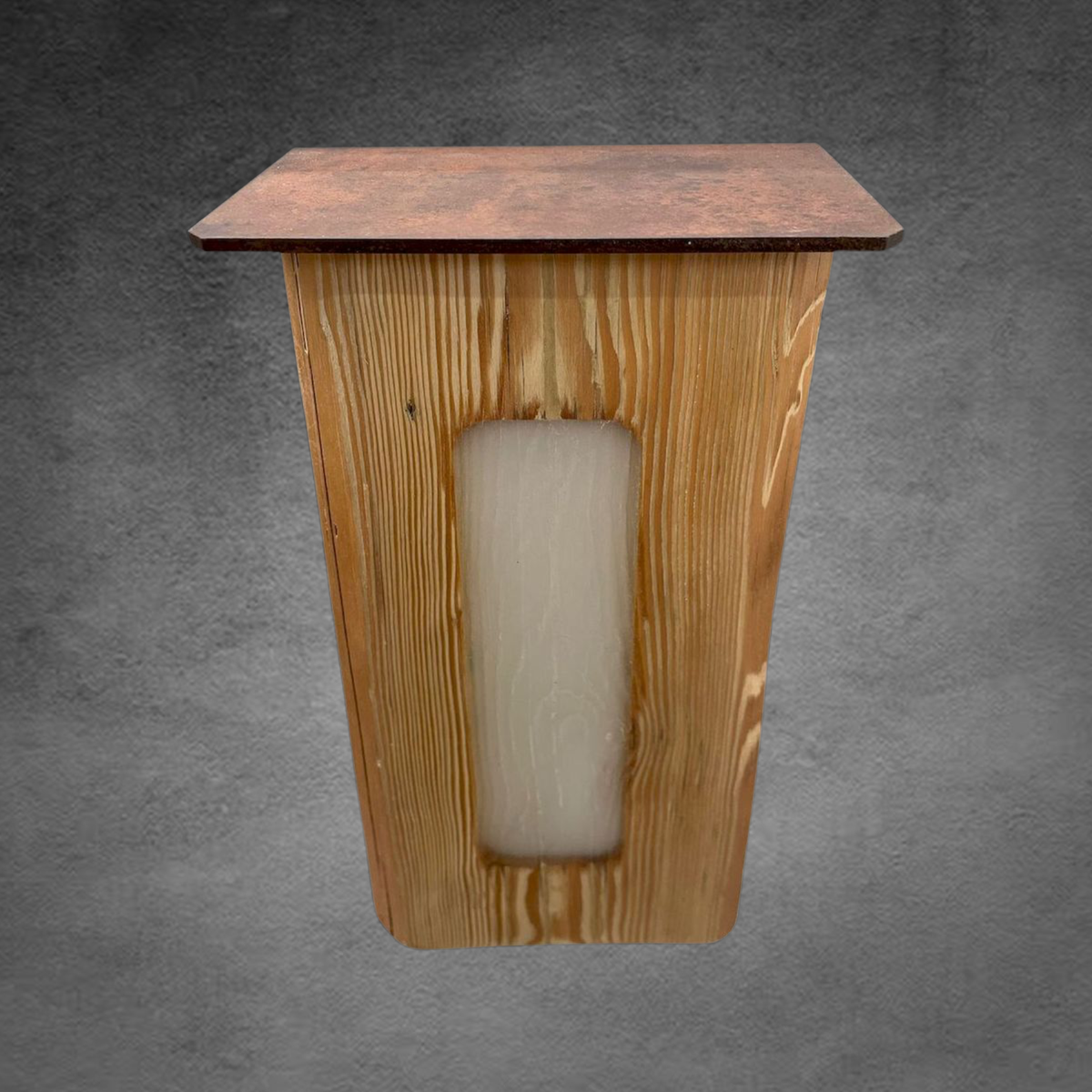 Die Kombination aus Altholz und Rostigem Metall gibt der Leuchte den nötigen Feinschliff.